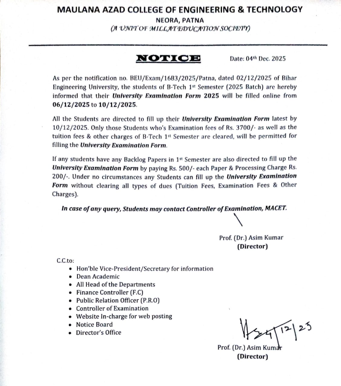 Notice for University Examination Form Filling of B-Tech 1st Sem 2025 Batch.Click here to view
