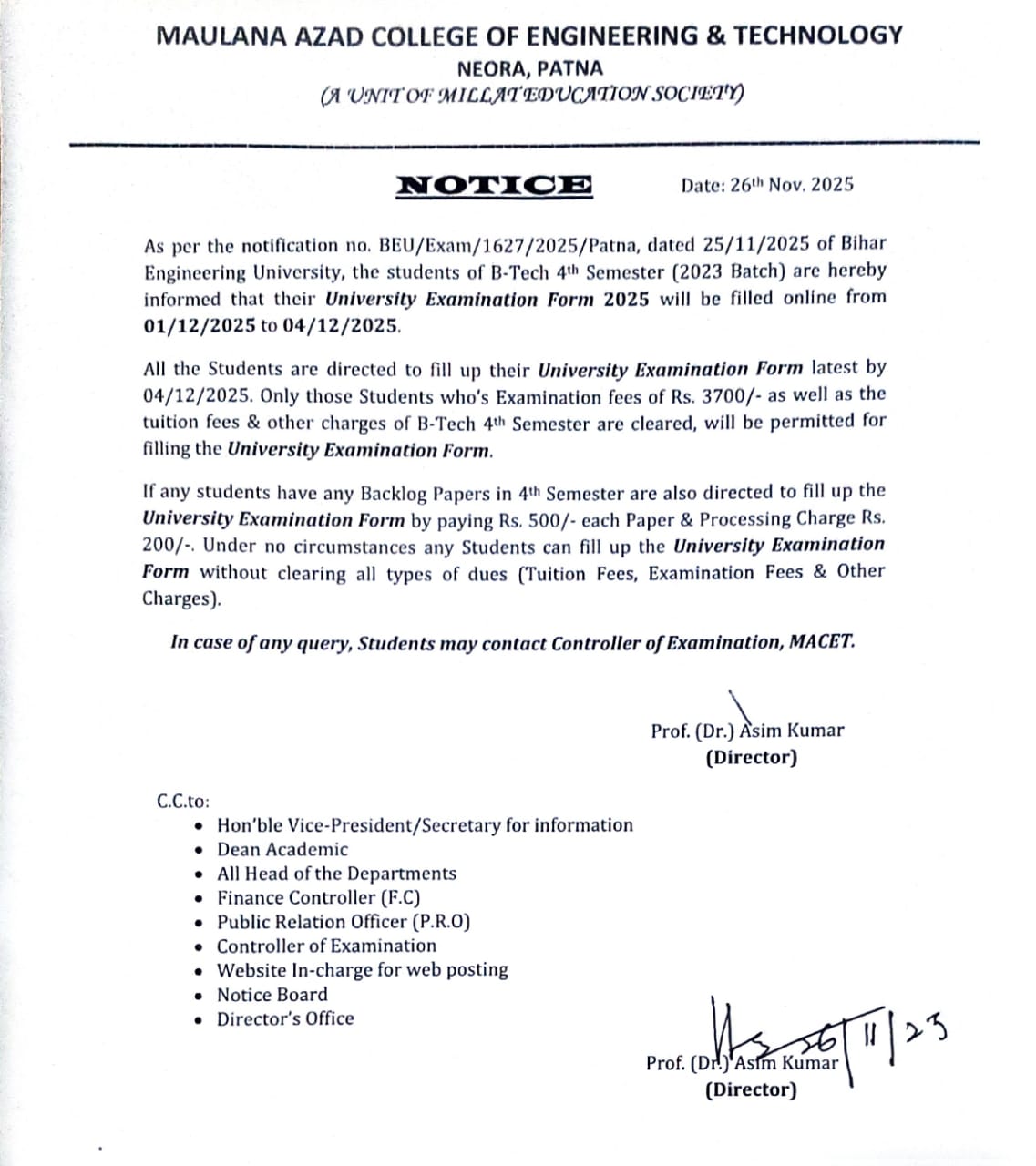 Notice for University Form Filling of 4th Sem 2023 Batch.Click here to view