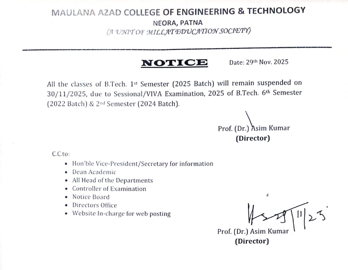 Notice regarding class suspension of B-Tech 6th semester.Click here to view